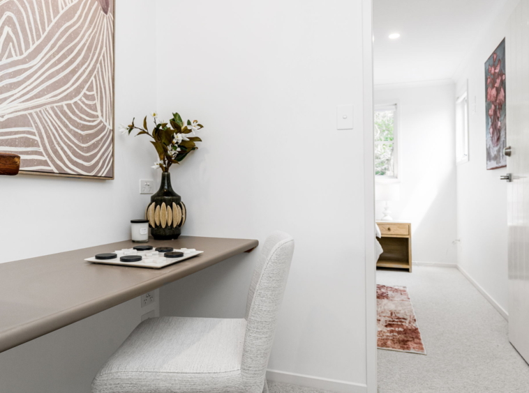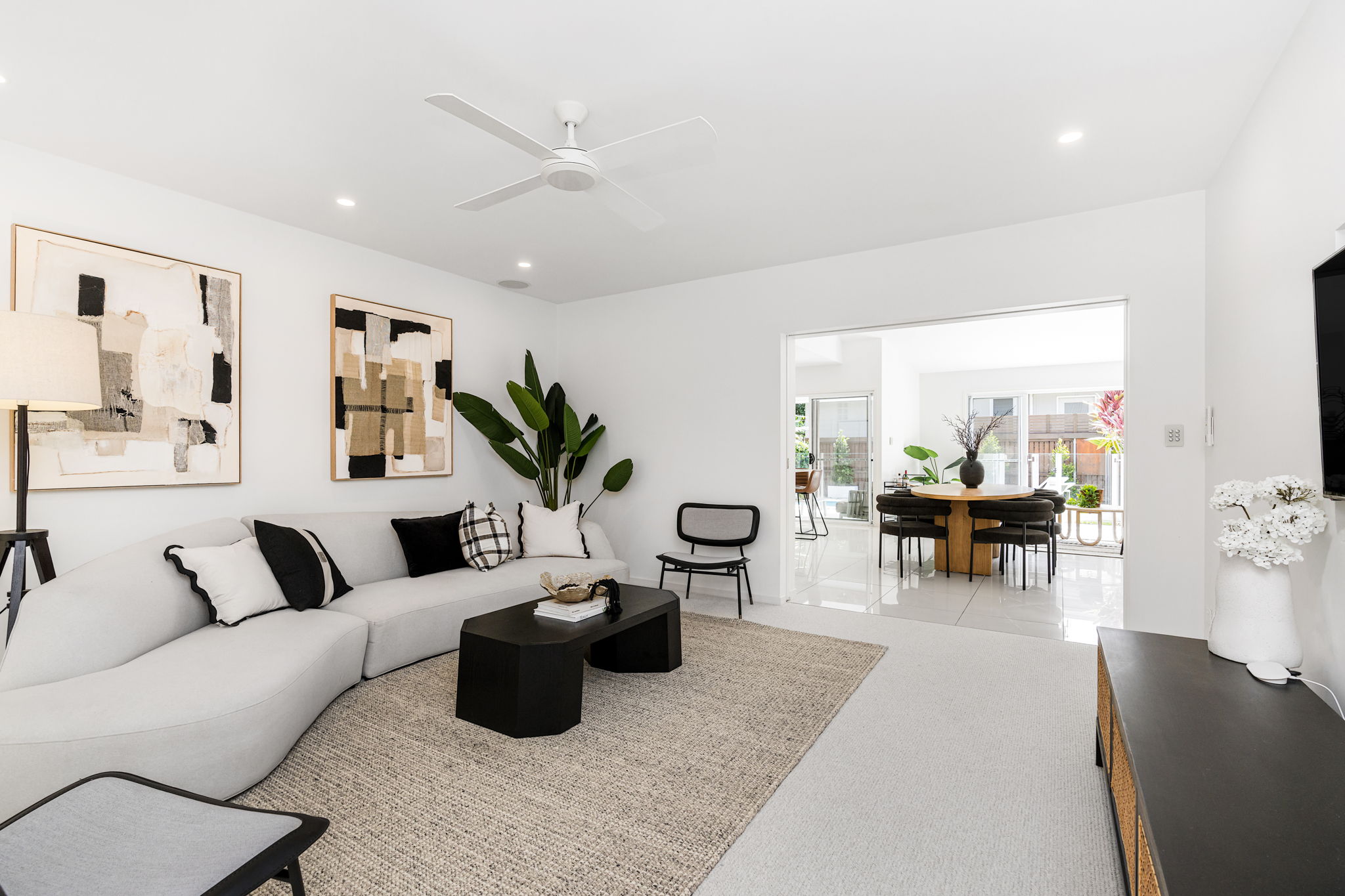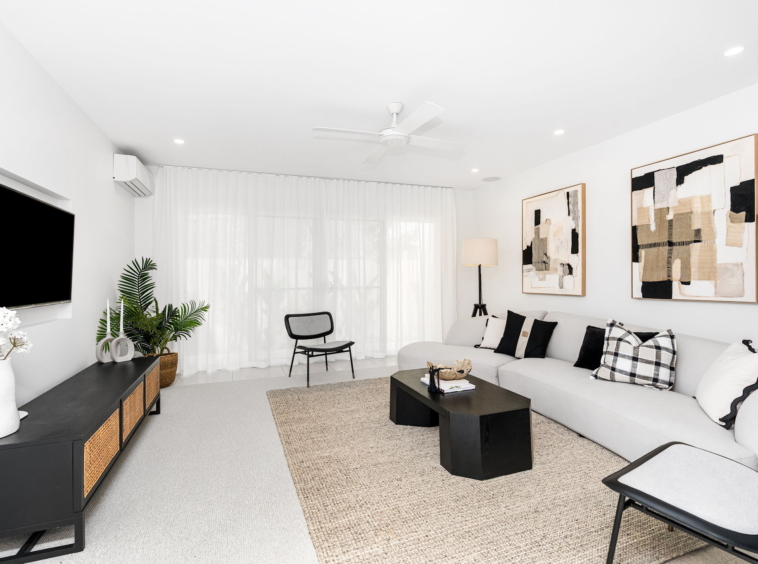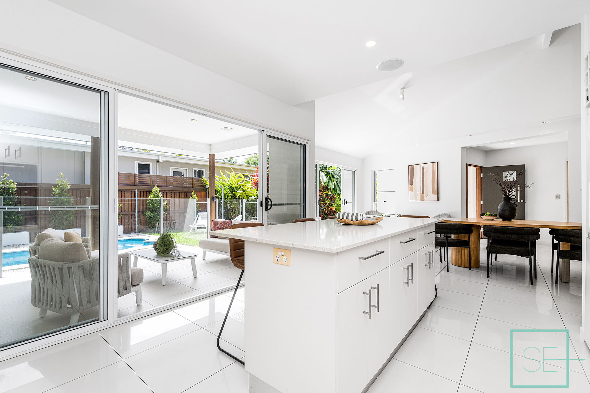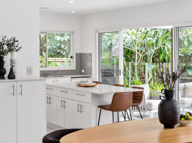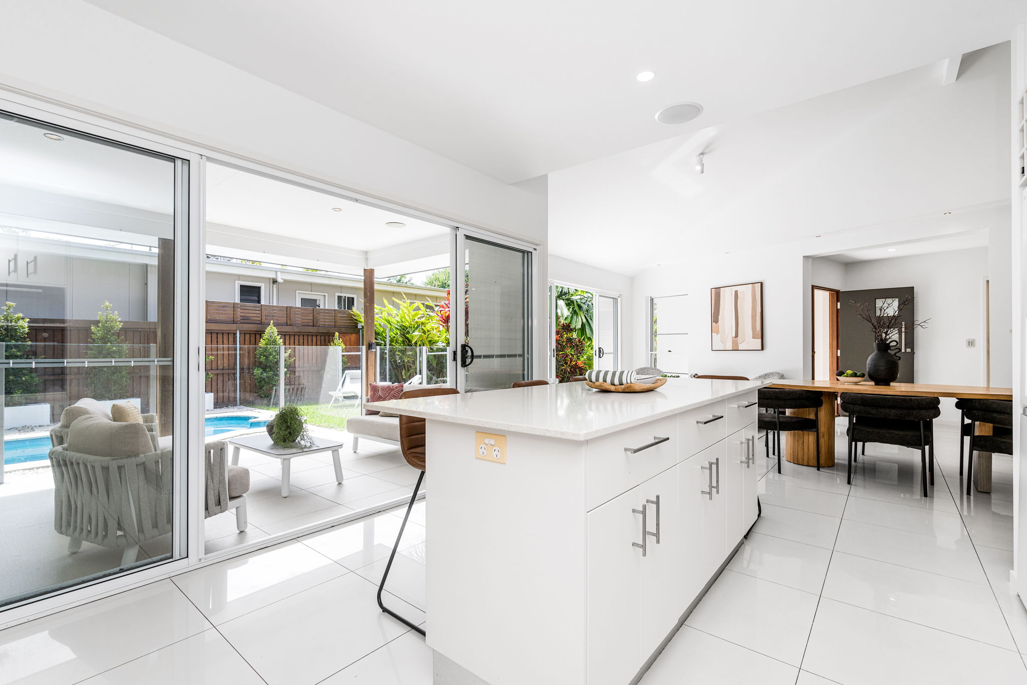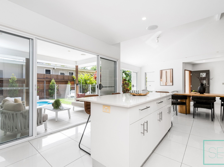 Light-filled interiors, high ceilings, and stone finishes create a sense of warmth, while the open-plan kitchen, living, and dining area flows seamlessly to the covered alfresco, perfect for entertaining or relaxing by the sparkling in-ground plunge pool.